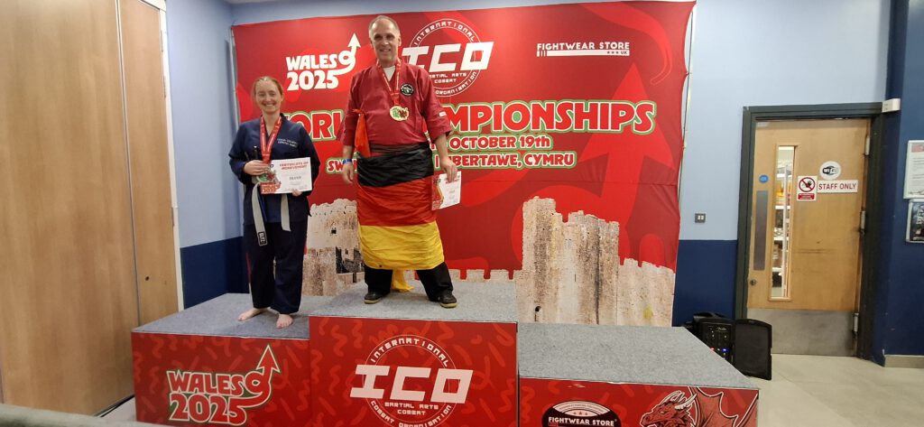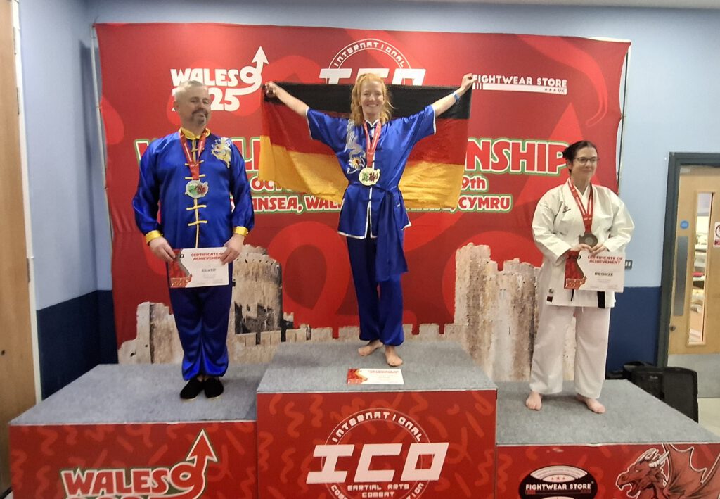 Dieses Jahr fand die WM der ICO in Swansea, Wales statt und unsere Schüler Stefan Scholz und Yvonne Kamps haben die Goldmedaillen im Kampf, Form und Waffen nach Bahrenfeld geholt. So sehen Sieger aus.